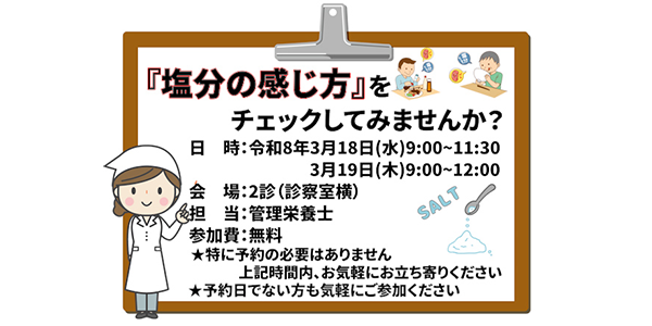 時間帯で「塩分の感じ方チェック」を参加費無料で実施します。